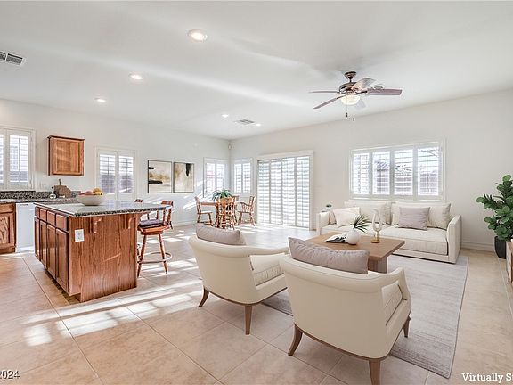 This modern open concept floor plan home features three spacious bedrooms and two bathrooms. The living area flows seamlessly into the kitchen and dining space, making it perfect for entertaining. The Large windows allow plenty of natural light, with shutters throughout the home. split floor plan offers privacy to the primary bedroom. Backyard has ample shade and mature trees. The property is located in Mountain Falls community that offers fantastic amenities, including a swimming pool and access to a golf course, fitness center and jogging/walking trails throughout the community.
