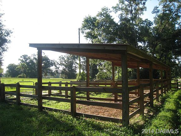 Equestrian Estate! 10.80 Acres with big beautiful oaks on SR 11. Located close to equestrian events and only a short distance to Deland. Two separate paddocks with 5 run-in stalls, tack/ feed room complete with sink and electric, large round pen and irrigated field. The irrigation system is run by a new self-priming pump with timer. This ranch is well thought out with attention to detail. Amazing brick home completely remodeled. 2BD/2.5BTH New oak kitchen cabinets, granite countertops, and stainless appliances complete the kitchen with a view that overlooks a shady backyard and paddock. An open floor plan and volume ceilings. The fireplace may be viewed from the kitchen, den and living room. Stately finished Vermont slate covers the roomy den floor. The master bath boasts a huge walk i n shower with river rock flooring, double shower heads, large Jacuzzi tub with multi lighting and bidet! Lots of walk in closet space for the Master and nice outside brick shower!