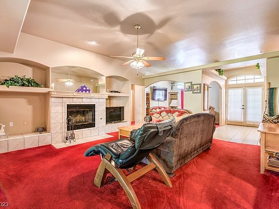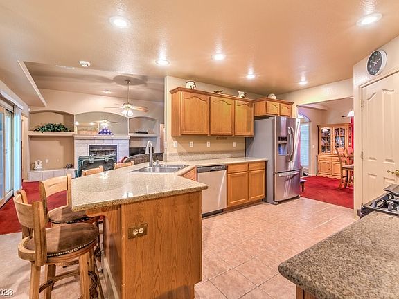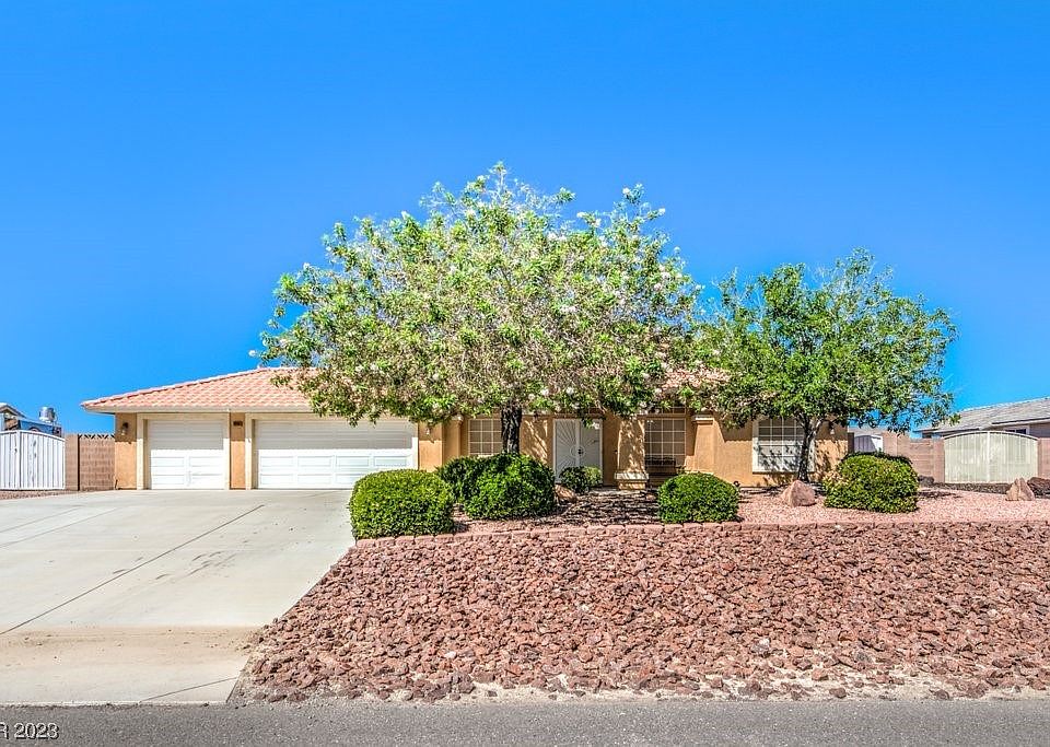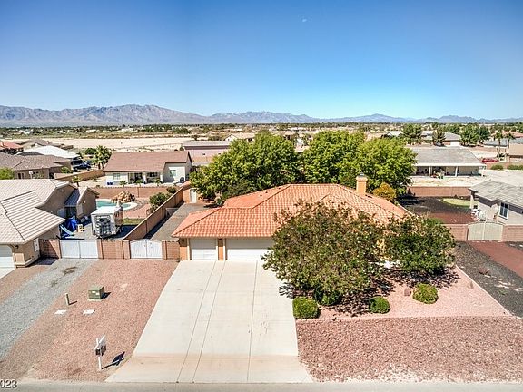 Spacious home with 2142 sq ft of living space, 4 bedrooms, 3 full baths, oversized 3 car garage, all on over a 13,000 sq ft lot. Lush green back yard with shed, gated RV parking and an expanded patio for amazing outdoor living. Spacious kitchen with ample counter space, stainless appliances, and walk-in pantry, all centrally located in the heart of the home. Primary suite has plenty of space with door leading to the patio, double sinks, walk-in closet, walk in shower and separate tub. Back yard offers plenty of shade with an expanded patio, amazing lawn, mature trees and shrubs. Wood burning fireplace in the living area, formal dining area along with kitchen eating nook and large windows bring in plenty of natural lighting that flows to the back yard. Artesia offers a community clubhouse, easy access to Hwy 160 for Las Vegas commuters. Also near schools, amenities, and town of Pahrump.