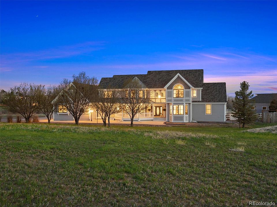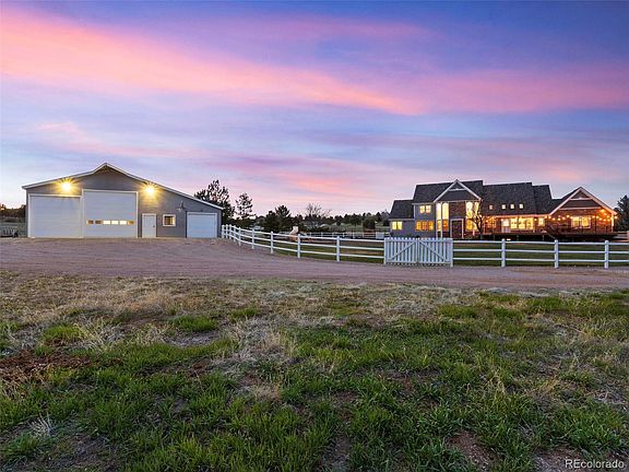 Situated on a picturesque 4.48 acre site this charming farmhouse has incredible southwest mountain views and perfectly captures Pikes Peak and Devil's Head. Architectural details include vaulted ceilings and a spacious floor plan with large windows and skylights which fill the home with natural light. The home has been extensively updated with a wonderful gourmet Kitchen, adorable bedroom suites, charming laundry and mud room, extensive hardwood flooring and crisp modern paint hues. The sunlit Kitchen features stainless steel appliances, expansive center island, custom cabinetry, tile backsplash and large breakfast nook. Appliances include Jenn-aire double ovens and four burner gas cooktop, Bosch dishwasher, refrigerator and beverage cooler. A stunning two story Great Room with gas fireplace and floor to ceiling windows provide a lovely view of the back yard. Main level living offers a Primary Suite with spacious five piece bathroom and large walk-in closet, serene Study with built-in cabinetry and separate Dining Room with bay windows. The upper level has four more large bedrooms each with their own unique charm, including an adorable loft space and art niche. The lower level is easily accessed by two staircases and features a 1200+ square foot woodworking shop, complete with compressor and open recreation area complete with climbing wall. This home is on an incredibly beautiful lot with a huge outbuilding allowing for additional car storage, RV and ATV storage and indoor play space. A fabulous brand new 1260 square foot deck offers additional entertainment space and overlooks a flagstone fire pit, underground trampoline, playground, veggie garden and chicken coop. Recent upgrades include carpeting, paint, deck, dishwasher and lighting. The Hills at Bayou Gulch is a wonderful neighborhood with large pastoral lots and expansive views which is reminiscent of days gone by. The Town of Parker offers local shopping, nearby amenities and highly rated schools.