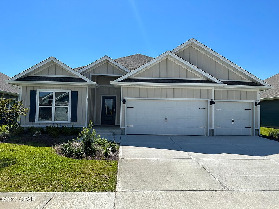 The Destin is a single story detached home that is in the highly desirable community of Titus Park. Located on the north east side of Panama City, Titus Park is a short drive to downtown Panama City, the Gulf of Mexico with sugar sand beaches, Tyndall Air Force Base, shopping, dining, and more! The home has a private entrance with concrete pathway, steps, and designer landscaping. Inside, you are warmly greeted by engineered vinyl plank floors that lead to a bright and open floor plan seamlessly connecting the kitchen to the living room and leading to the inviting, sunny backyard. Meticulous attention to detail is presented in the kitchen with granite countertops, white cabinetry with brushed nickel knobs, and stainless steel Whirlpool appliances which includes the following: stove, dishwasher, and microwave. A 10' tray ceiling with beautiful crown molding gives the living area have a very open feel. The 1st bedroom is located directly off of the living area and also features a tray ceiling with crown molding, and a bathroom featuring a double vanity, large shower, full size soaking tub, and a walk in closet. There are 3 additional bedrooms located adjacent to 2 other full bathrooms. The back patio is a wonderful entertainment space for family and friends. There is more than ample storage available in the 3 car garage. New homes in Titus Park also feature a smart home system that includes a KiwkSet Keyless Entry, Skybell doorbell, automated front porch lighting, an Echo Dot, and a Qolsys touch pad, and customizable LED lighting. Our model home is open Monday through Saturday 10-5PM and Sunday 1-5PM.