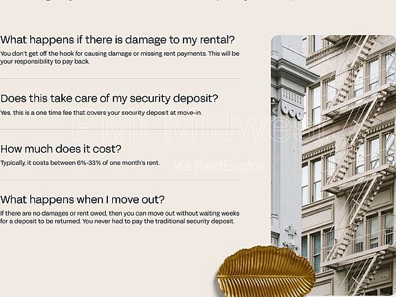 All PMI Midwest residents are enrolled in the Resident Benefits Package (RBP) for $36.95/month which includes credit building to help boost the resident's credit score with timely rent payments, HVAC air filter delivery (for applicable properties), move-in concierge service making utility connection and home service setup a breeze during your move-in, our best-in-class resident rewards program, on-demand pest control, and much more! More details upon application.