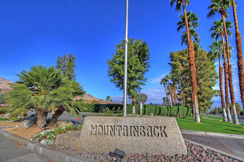 Location-Location-Location! This delightful condo is nestled into the foothills of the Santa Rosa Cove of mountains in Trendy South Palm Desert. Just a short saunter to fashionable El Paseo home to upscale restaurants, galleries and designer retail. Mountainback is a development of 101 condos with four pools, two spas and three tennis courts. Low density provides grassy knolls for walks and hiking and biking trails are located close by. Two Bedrooms upstairs , two baths, powder room downstairs, full bath up, with separate vanities for each bedroom a cozy fireplace, two patios accessed from either the kitchen or the living room make this a light and bright unit with an indoor/outdoor accessibility that is what desert living is all about. Tile floors down and carpeted stairway and upstairs bedrooms. Stairway with a clerestory window provides abundant ambient light to both levels. The kitchen has black appliances all stay and a spacious pantry. Extra storage under the stairway. The upstairs laundry closet holds full size appliances that are included. Abundant citrus trees provide a variety of fresh fruit. Two parking spaces: one covered and one open complete this affordable and well located unit.