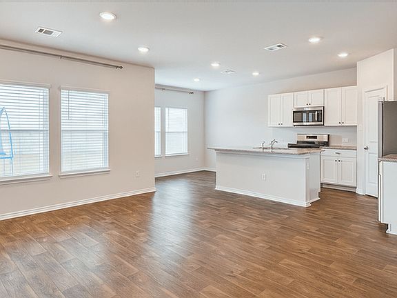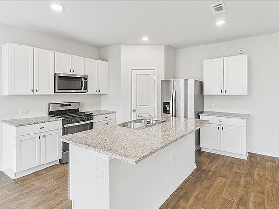 Gas cookingPlush carpetVinyl plank flooringGranite countertopsFenced backyardWhite cabinetryOpen great room design
