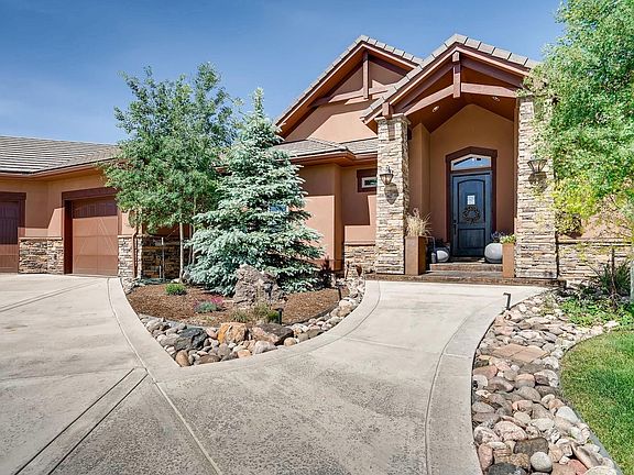 Gorgeous 4br/3ba/5+car mountain contemporary ranch estate sits high on 2+ acres at 4883 Carefree Trl in Parker's Pradera community. Enjoy drinks and big views from the unique patio surrounded by a cascading waterfall that overlooks the 14th green of the beautiful Pradera golf course. A car lover's dream, park your collector cars in the bonus 2-car specialty garage with attached car display room with bar, WY snow fence wall, high gloss cabinets. Or, convert to a MIL. A chef's kitchen has granite counters, bar, high-end SS appliances, rich wood under lit cabs. Vaulted ceilings, wood beams and double-sided fireplace adds to the style in the family room. The luxurious master suite has a 6 piece bathroom with custom closet and door to the covered patio. A media room with projection and surround sound, 2 bedrooms and bath, plenty of storage are in the basement. Low HOA dues include community pool, tennis, trash/snow removal. Come experience the luxury, views and open feel of Pradera living.