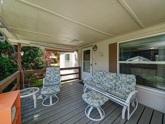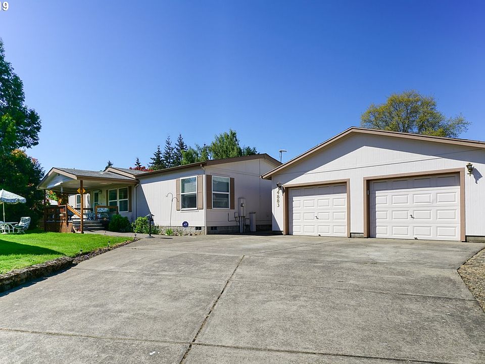 Great buy on this 1998 double wide with oversized 2 car detached garage/shop. Located on quiet culdesac in Old Oak Estates. Private fenced backyard with raised bed. Large covered deck for outdoor enjoyment. Home features 1404 SF with vaulted open floor plan, skylights, laminate floors. Spacious kitchen with island plus dining area. All appliances included. Three bdrms, 2 baths, Inside utility room. Heat pump! Easy access to I-5.