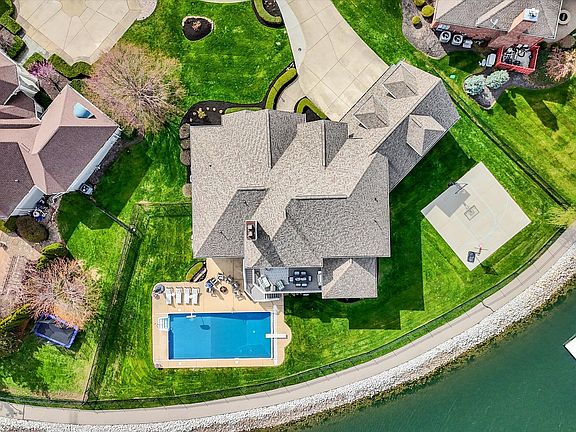 Are you seeking endless natural light, panoramic water views & breathtaking sunsets from the comfort of your living room all within the top-rated Carmel school district? Look no further as you step into your private oasis w/ 180 degree water views in the highly sought after Bayhill swim/tennis community. This stunning estate is nestled on a private cul-de-sac & offers endless space to relax & entertain w/ a grand two-story great room, expansive windows throughout, multiple fireplaces & spacious finished walk-out lower level, every inch of this home exudes elegance and comfort. The kitchen features a large eat-in island, office nook & adjoining harvest room is perfect for additional seating overlooking the lake. The formal dining room & thoughtfully designed mudroom w/ custom storage lockers add both charm and function. The main floor owner's suite is a true retreat, complete with sweeping lake views, a spa-like bath w/ double vanities, whirlpool tub, tiled shower, & generous his/hers walk-in closet. Retreat to the updated private office w/ French doors & custom built-ins. Upstairs, you'll find 4 generously sized bedrooms, including one that can serve as a large bonus room, media room, or playroom. The walk-out LL is lined with floor to ceiling windows & is an entertainer's paradise-featuring a full wet bar, expansive rec room, bonus room or fitness area, and a full bath. Could easily convert rec room into a 6th bedroom. Storage abounds with a giant level walk-in storage room. Step outside to your own private oasis w/ a fully fenced backyard, updated in-ground, heated saltwater pool, half basketball/pickleball court, & multiple entertaining spaces including a large deck, covered patio, and a spacious poolside area-all showcasing stunning lake views w/ an included boat dock (with Quest Pontoon boat available). Fish in the stocked lake right out of your backyard & enjoy all the natural beauty this peaceful lakefront home has to offer.