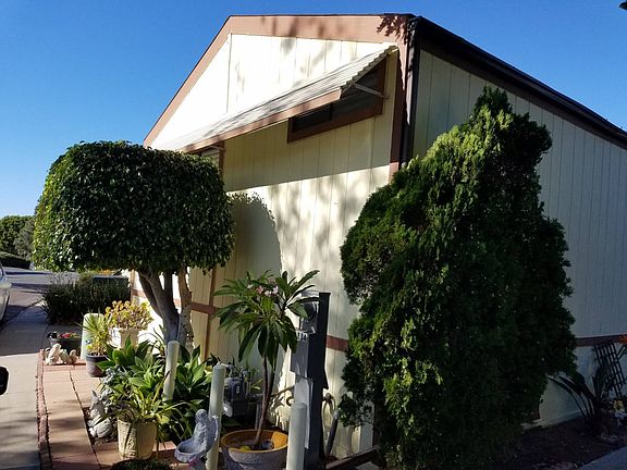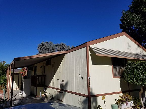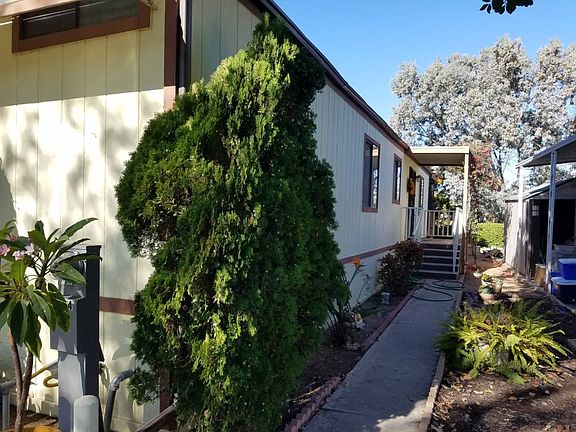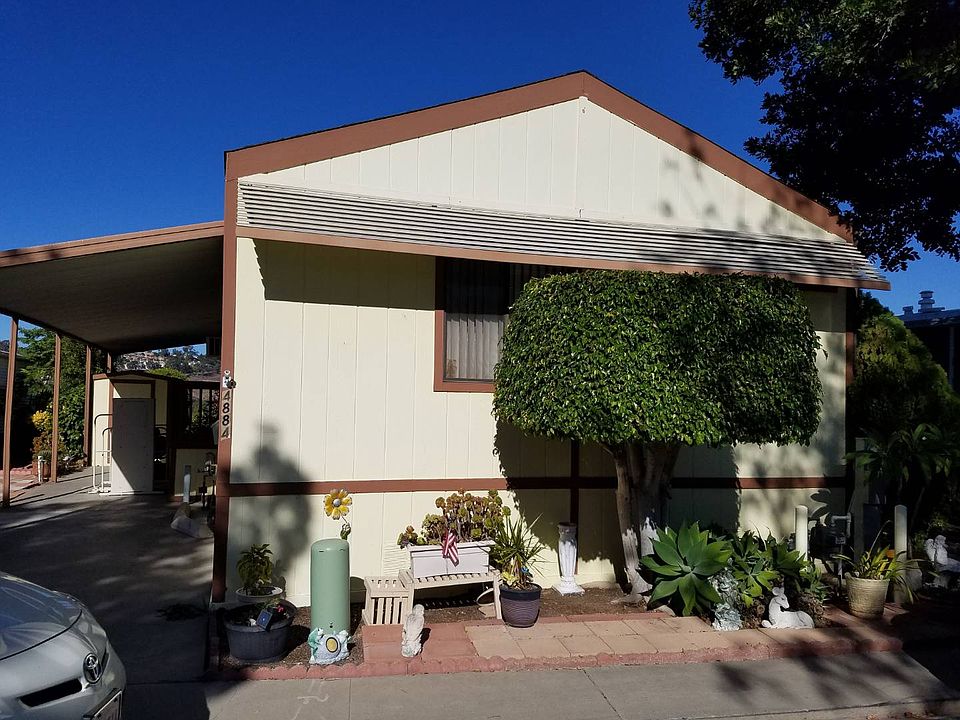 Home features a vaulted ceiling, wall air conditioner and 3 ceiling fans. With just over 1000 sf the open floor plan feels much bigger. Light, bright and spacious kitchen with tile flooring, sit down counter, dishwasher, refrigerator and above the stove microwave. Nice sized bedrooms, master bath has ample sink counter, soaking tub and shower. Laundry room has convenient storage cabinets with full size washer and dryer.There is a handicapped lift in the carport, shed and flagstone walkway to the backyard. An easy care yard with plumeria, sego palm, lemon tree and mature shrubs. The living room, dining room and full width covered deck have views to the North and East overlooking Mission Gorge, Admiral Baker Golf Course and the San Diego River!(LAR1806)