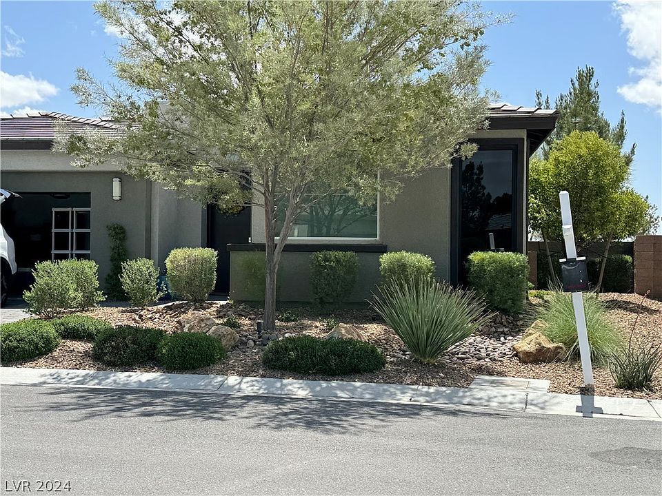 This property was formerly utilized as a sales office, complete with all the luxurious amenities and high-end finishes that served as a source of inspiration. This home is a stylish and functional 2 bed, 2 bath home with a 2 car garage, spanning 1644 sq ft. It boasts professional landscaping with extended pavers, enhancing its curb appeal. complemented by a tranquil fountain in the courtyard. Inside, the front bedroom features floor-to-ceiling windows, allowing natural light to flood the space and offering picturesque views. The kitchen is adorned with modern amenities, including a built-in fridge and elegant grey quartz countertops, adding both beauty and functionality to the space. The garage is tiled and equipped with a wine cooler, making it an ideal space for entertaining. With its blend of luxurious features and practical design elements, this property offers a comfortable and inviting living space for its fortunate occupants.