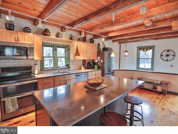 Unique & desirable property in Upper Milford! Converter 1800's Barn with modern conveniences! Custom hardscaping & landscaping! Quality & character are eminent as you walk through each room! Main floor boasts an open & airy concept floor plan! Pine wood floors, exposed barn beams, exposed stone, & floor to ceiling windows! Open living room invites you to cuddle up in front of the propane stove or enjoy the peaceful surroundings on the second floor deck! Gourmet kitchen with an abundance of cabinet space & extra space! Eat at island, quartz counters, pendent lighting,& easy access to the main floor laundry room & half bath! Dining room with shiplap walls & views of the yard and wildlife! Second floor master bedroom suite with sliding barn door, oversized closet space, full bath with soaking tub/shower & vanity area! Two more nice sized bedrooms with ample closet space & another full bath complete this floor! One car garage with carport! Central air, metal roof & low maintenance exterior!