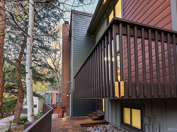 The Details Make The Difference. Wood Floors throughout. Staircase rebuilt with rustic wood stairs and custom wrought iron railings. Fireplace/ wood stove replaced and new flue installed. New kitchen cabinets and stainless steel appliances. Updated light fixtures throughout the home. High ceilings in the living room and access to the deck. Lots of light. Two bathrooms were combined to create a larger bath for the Primary suite and Walk-in custom closet Come home to turnkey! Central location with the ability to walk to the lake and downtown Evergreen. Small creek and wooded area around the complex to enjoy nature.