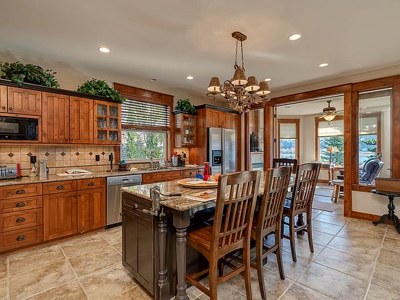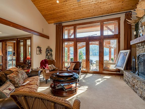 Beautiful Waterfront property on the Spokane River in Coeur d'Alene with 75 feet of waterfront and a private dock. House has nice finish work with great views, main floor master, another full kitchen upstairs and a guest house with kitchenette above the spacious 4 car tandem garage. Great outdoor living space with courtyard, fireplace, new hot tub, and grassy backyard down to the river. Too much to list, must see!