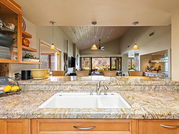 Spectacular golf course and mountain views in a private elevated setting above the 10th fairway of Ironwood North course. Enjoy sweeping 180-degree views with breathtaking sunrise & moonrise above Mt. Eisenhower. This Freestanding Skyview plan has been expanded to include 2-bedrooms, 2-baths plus den, spacious office and breakfast room. The kitchen features a SubZero fridge, 5-burner gas cooktop, Dacor oven & Bosch dishwasher, granite countertops and plenty of cabinet space. Added breakfast room off of the kitchen looks onto a private walled courtyard with desert landscaping and Western mountains.A great home for entertaining with spacious floorplan and Great Room doors opening to a large patio with overhead heaters and built-in-BBQ cook center. Enjoy Patio dining overlooking majestic mountains & fairways with down valley views.The Primary bedroom has a private alcove entry and a wall of windows to capture the beautiful setting. Plenty of space for desk, office or library area and main bathroom with walk-in closet, tub and convenient washer/dryer closet. Guest bedroom & bath are separated by a cozy den with south-facing patio. A large separate office is located off of the Great Room and is a versatile space to function as a double office or art studio.The garage has epoxy flooring and built-in cabinets with room for 2-cars or car + 2-golf carts.This property has been well-maintained and it is a rare opportunity for one of the best locations in Ironwood.