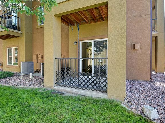 No stairs! Beautiful 2 bedroom, 2 bath, ground level ranch style condo with attached 1 car garage! Just walk right in from inside your garage or front door. Move-in ready! New luxury vinyl plank flooring and new paint throughout. Brand new stainless appliances! Modern features include high nine foot ceilings with crown molding, gas fireplace, large dining area, and plenty of closet space. Shows like a model, and you can see Pikes Peak out the back sliding glass door. AC ready. HOA dues include insurance, water and sewer for your unit and you just pay gas and electric. Second parking space in driveway in front of garage. Additional guest parking nearby. Clubhouse has a pool, gym, full kitchen and dining area, and a conference room. Great security within a gated community. And this condo complex sits right next to Sandstone Park with gorgeous mountain views, picnic tables and a playground. Very practical maintenance free living, great location close to Powers corridor, restaurants, shopping, everything you need. Worry free if you travel, what could be better? Keep life affordable and simple.