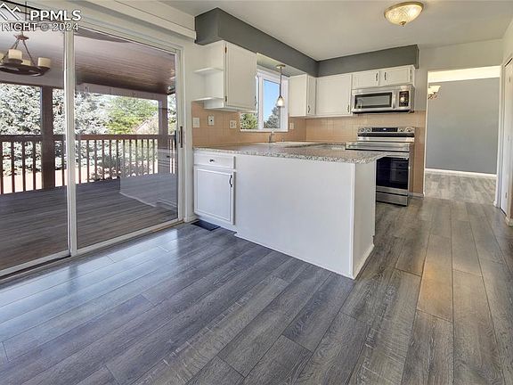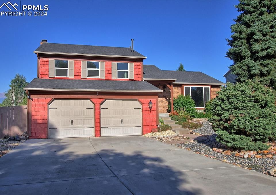 Charming three bedroom three bath 4-level home with Pikes Peak views, large yard, granite countertops, stainless appliances, newer vinyl flooring, wood burning fireplace, lots of storage, covered porch, oversized two-car garage, plenty of room for parking