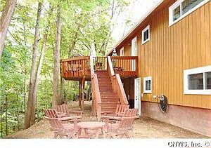 Adirondack setting surrounded by tall trees. Fabulous open floor plan, vaulted ceilings, hardwoods throughout, boasting 2,200 sq.ft. Formal dining room, fully equipped eat-in kitchen, grand sized family room. King sized master bedroom w/full bath. 2 more bedrooms in lower level with full bath. New roof, new windows, newer furnace, central air, freshly painted. Oversized 2-car garage.