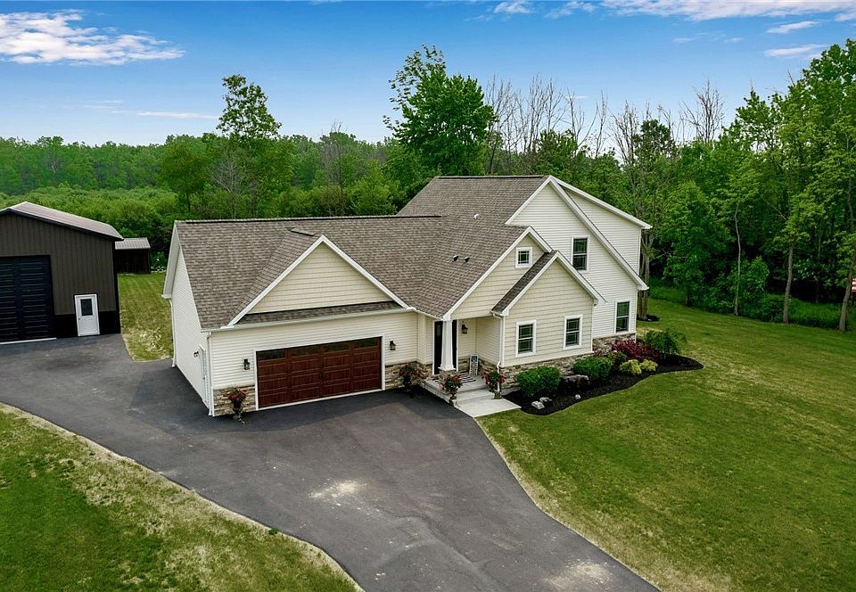 Experience the perfect blend of style, comfort, and nature at 4889 S. Newstead Road. Constructed in 2020, the open first-floor plan creates a spacious & connected atmosphere, flooded with natural light & leading to a tiered rear patio featuring a built-in fire pit & covered outdoor dining space. First-floor primary bed w/ walk-in closet & en suite bathroom. Second floor offers 2 spacious bedrooms & additional full bath. Partially finished basement is a haven for entertainment, complete w/ custom bar to host unforgettable gatherings with friends & family, effortlessly transitioning from casual hangouts to lively celebrations. Attached 2+ car garage & additional detached 30x40 pole barn featuring a massive 14-foot overhead door. It's the ideal space for storing vehicles or indulging in creative pursuits. Situated on a sprawling 4.9-acre lot surrounded by beautiful woods, this property offers a peaceful escape from the daily grind. 1st Floor Laundry, Central Air, Whole-house Generator & Security System. Home offers an assumable VA Mortgage at under 3% interest rate for those that qualify. Delayed showings until Open House Thursday, June 8th at 6-8 PM.