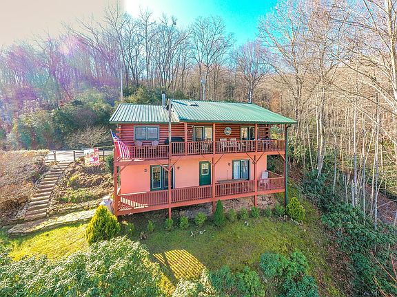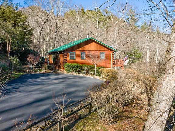 Looking for that wonderful mountain home with year-round views? Look no further with this 2 bedroom 2.5 bath beautiful log cabin nestled perfectly on a private approx 4.54 acres with easy paved-to-the-door access from HWY 441. Enter this well maintained home with Caribbean Heart Pine floors, vaulted ceilings, stone wood burning fireplace, skylights to take bring in natural light, and two bedrooms with ensuite in primary and half bathroom in second bedroom - all the main floor. Step out on the partially covered porch to sip your morning coffee, take in those gorgeous year-round views of the beautiful mountains and listen to the stream that runs below the property. On the lower level you will find an additional bonus room with a full bathroom, stacked stone gas log fireplace, a spacious family room and a lower porch. Outside of this amazing cabin you will notice the mature landscaping, flagstone walk-ways, water feature and a spacious 18x36 storage building that coordinates with the cabin perfectly. Although you may have privacy from your human neighbors you will be amongst the mountains most beautiful wildlife. Relaxation and privacy at it's best! This log cabin is truly a MUST see!
