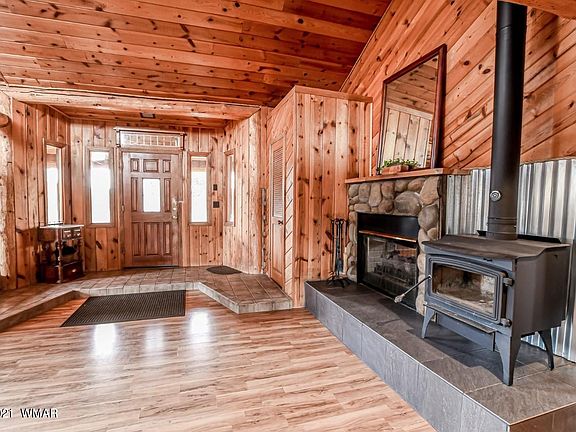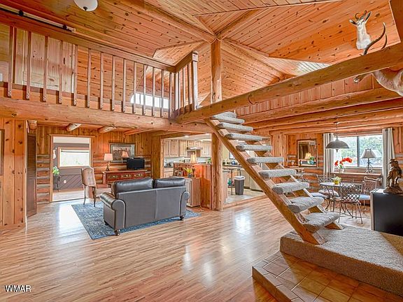 Full log cabin on 8.55 acres of horse property with three stall barn that has a private full guest house above it. Main cabin is fully remodeled, has three bedrooms, one full bath. Open floor plan with entertainers kitchen. Two sided fireplace featured in living room & master bedroom. Plus a wood stove! T & G through out the home for the cabin feel. Big covered decks for enjoying the four seasons in the White Mountains. Guest home above barn is over 750 sq ft has large windows, amazing views and private entrance. Barn features work shop area, bathroom, office, garage door and storage galore. Plus three covered stalls!Large wells makes it easy to have horses, livestock and green pastures! Property is fully fenced, cross fenced there is even a pond! Don't miss this property it has it all!
