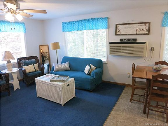 Picture perfect 2 Bedroom 1 and 1/2 bath home across the street from Amston Lake. Possible conversion to year round. Split unit in living room provides heat and air conditioning. Huge deck with views of the lake. New paved driveway. City sewer and water lien paid off. Close to the boat launch and the association beach.