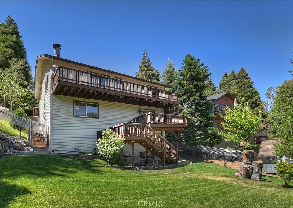 Discover your perfect retreat in this stunning 3-bedroom, 2-bathroom home offering an impressive 2,136 sq ft of gross area, thoughtfully designed for comfort and style. Conveniently equipped with central heating and air conditioning, this gem also includes dual-pane windows for energy efficiency and a garage for added convenience. Located just a short stroll from Crestline's scenic Lake Gregory and a popular yoga studio, this property provides the ideal blend of accessibility and tranquility. Set on a picturesque 5,550 sq ft usable lot, this home features one of the few fully grassed and fenced backyards in Crestline, making it a haven for outdoor enjoyment. The enchanting outdoor space showcases a majestic 15-foot Blackberry Bush, serene Japanese Maple Trees, a practical storage shed, and a captivating rock waterfall & pond, providing a serene backdrop for relaxation. Step inside to admire the luxurious Koa Brazilian hardwood floors that flow throughout the home. The vaulted ceilings in the living room create an open and airy ambiance, enhanced by remote control skylights that invite natural light into your living space. This home is equipped with a 6-year-old shingled roof with a 30-year warranty, vinyl siding, and an automatic Generac standby generator to ensure comfort during stormy weather. Entertain with ease from the newly stained 2-car deck parking leading to a level front door entry. The inviting front porch is adorned with a beautiful Cherry Tree, boasting four different varieties of cherries, and an Apple Tree with an array of four diverse apples. The main living room, featuring a cozy rock wall gas & wood fireplace, seamlessly connects to the kitchen, which is complete with new butcher block counters and a window overlooking a lovely rose garden and flourishing fruit trees. On the bottom floor, you'll find a full bathroom with heated floors and custom shelves, alongside two spacious bedrooms with access to a private back deck that shares spectacular views. Retreat to the primary bedroom, designed for comfort with his and her closets, one of which is a custom-built 7x12 ft walk-in. Just outside, unwind in a well-maintained covered Jacuzzi while soaking in the tranquil sounds of nature and stunning mountain views. With remarkable sunsets, starry nights, and breathtaking mountain views, this home is truly a sanctuary for those seeking serenity and the beauty of mountain living!