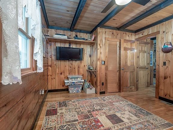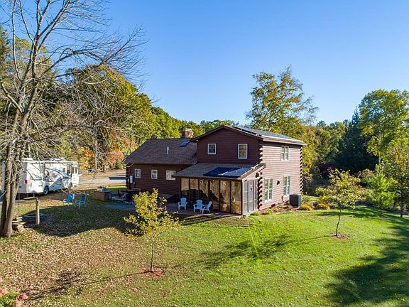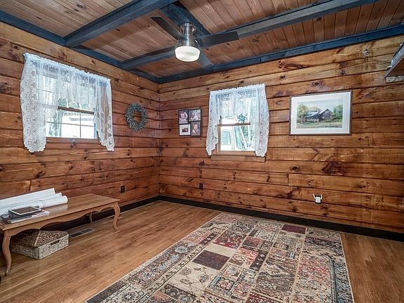Well Maintained Log Cabin Style home with 2,496+- sq ft of living area, This home is beautifully set back from street, and offers a large 3.6 acre lot, Enter through the Mud rm with blt in cabinets, The warmth of the log home is felt as you enter this bright and sun drenched home, Large open dining room with soaring sky light lit two story cathedral ceiling, Wonderful kitchen with custom Hickory cabinets with newer stainless steel appliances and granite counters, that leads to the huge family room, features large windows, beamed ceiling, & boxed window, and gas log stove for ambiance, that leads to the 3 season overlooking the great back yard, Large Master Bedrm suite with 6 closets and a full bath with whirlpool type tub, 2 additional bedrms plus an extra room possible den or home office, Full basement with gas heater, Peerless boiler w/Hydro Air (new 2017) Heat and Central A/C, Out back has a barn with workshop, Established gardens, Raspberry, BlackBerry and Blueberry plants & More!