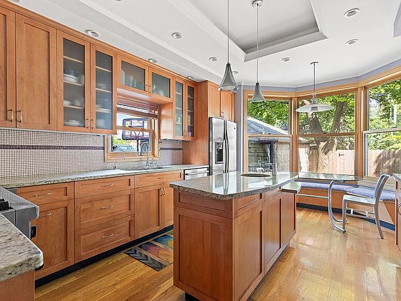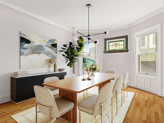 Nestled between charming Victorian houses on a tree lined street is 489 Marlborough Road, an enchanting 6-bedroom, 4 bathroom home with a shared driveway and garage. Lovingly maintained by the same owners for the last 40 years, the perfect proportions and layout of this classic beauty make this home a world unto itself with luxurious space, natural light and versatile, flexible living space. The inviting front porch welcomes you into a gracious entry foyer showcasing stunning architectural details that include the original stair and luminous stained glass windows.The spacious living room with a lovely gas fireplace and a bay of windows overlooking the street, flows into the formal dining room that can easily accommodate a table for ten or more. Next to the dining room is the bright, renovated eat-in kitchen with a long stretch of granite countertop, custom solid wood cabinetry that offers abundant storage, and an oversized island with a secondary sink. Top-of-the-line appliances include a six-burner Thermador stove with vented hood, Whirlpool refrigerator, and Bosch dishwasher. A huge bay window looking out onto the backyard has a cozy built-in banquette and table for casual dining. Off of the kitchen is a convenient powder room and a door to the sprawling backyard making enjoyment of the outdoors easy. On the second floor are four bedrooms and one and a half baths. The large Primary bedroom easily accommodates a king-sized bed plus additional furnishings and has a large walk-in closet and ensuite half bath. The additional bath features elegant vintage fixtures and breathtaking stained glass windows and a whirlpool tub and steam shower. On the third floor are three additional spacious bedrooms and a full bath. The finished basement offers great bonus living space and has a laundry area and plenty of storage space. Recent updates include a new boiler, hot water heater, central air conditioning, and custom double and triple pane Marvin windows. Located in close proximity to the vibrant shopping and restaurants of Cortelyou Road and Newkirk Plaza and the B & Q trains to Manhattan.