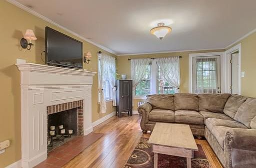Charming brick front dormered cape cod style home with 2 bedrooms and full bath on the upper level. 3rd bedroom and 1/2 bath on the main level. Gleaming hardwood floors on the main level were just refinished. Large living room with fireplace. Open kitchen/dining room with lots of cabinets and a built in hutch! Custom arched entry door to vestibule with French door. One deck overlooks the private back yard and a bonus covered sitting porch overlooking the side yard. Excellent commuter location close to schools, shopping, park and bus route.