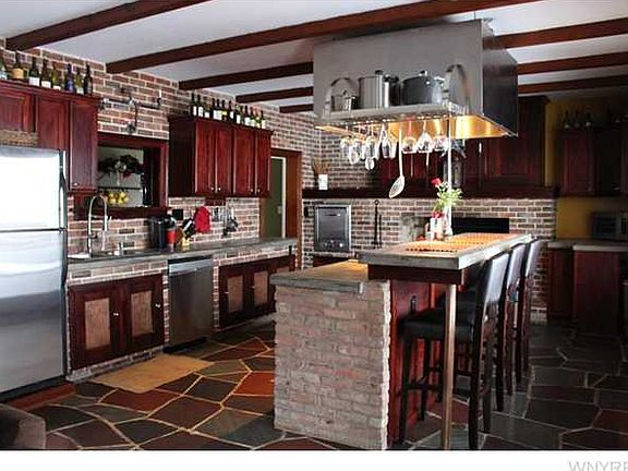 Large 3 bedroom 3 full bath raised ranch with many custom features. Huge picture windows overlook scenic yard with deck and block patio. Custom kitchen with built in wood burning fireplace, island with cook-top and breakfast bar. All upgraded bathrooms. Walk-out basement rec room w/ wet bar, comfy bonus room with vented gas fireplace and carpet. Other updates include windows and exterior doors, Central Air, 96% efficient boiler and tank less hot water, and asphalt roof. Home has 9ft ceilings, 2 car attached garage, shed, expansive attic storage space and custom outdoor stone fireplace.