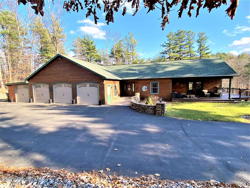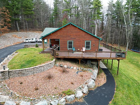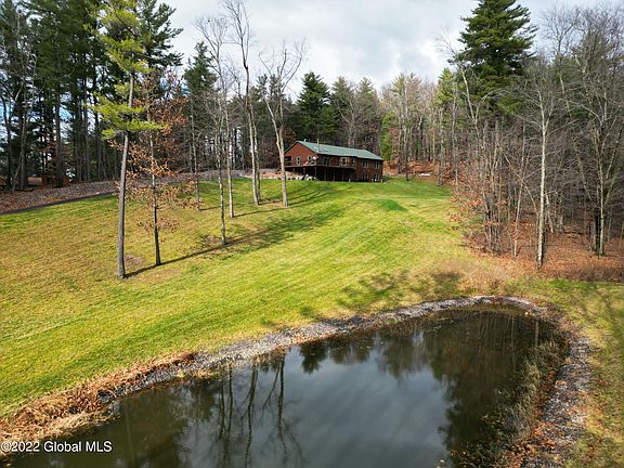Privacy and Tranquility are exactly what you get with this custom built home that sits tucked away on 2.74 lovely acres with over an acre of an invisible dog fence. Enjoy the amazing view of your own private pond and beautiful sunsets from your wrap around deck or covered patio. This home is perfect for entertaining with it's bright and open floor plan, stone fireplace, large eat in kitchen area with stainless steel appliances, kitchen Island and dramatic vaulted ceilings. The finished walk out basement and 4 car garage lends itself perfectly for any large growing family or in law needs. Great location, convenient to Regeneron, Amazon, I-90 access and all shopping.