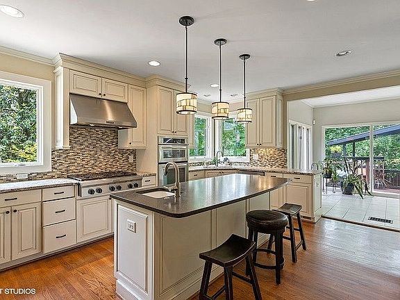 - Kitchen Features: Breakfast Bar, Cabinets Stain, Eat-in Kitchen, Pantry, View to Family Room, Stone Counters, Kitchen Island, Breakfast Room, Solid Surface Counters, Wine Rack