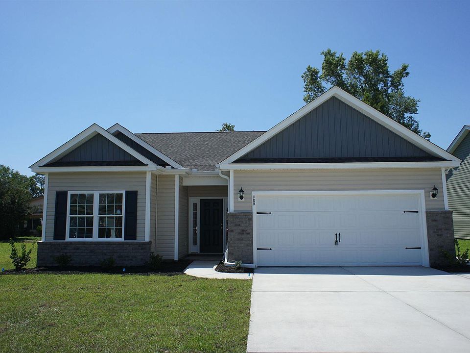 Beautiful Hatteras floor plan in the new Ocean Palms community. This terrific 3 bedroom, two bath, open floor plan home will have wood-look waterproof LVP flooring in living spaces, laundry, and baths, with carpet in all bedrooms. Stainless appliances, staggered-height Shaker-style painted cabinetry, granite counters, a walk-in pantry and a convenient breakfast bar combine to give the kitchen the wow factor you're looking for, and the abundant recessed lighting and double windows in both the adjacent dining area and great room flood the room with light. The large covered porch and concrete patio are accessed by a glass French door from the great room. The spacious owner's suite features an oversized walk-in shower, plenty of storage in the cabinetry and linen closet, plus a walk-in closet. Two additional bedrooms and a bath are tucked away on their own hallway, for privacy. All of the homes in Ocean Palms come standard with the luxury of natural gas (tankless water heater, gas heat and a gas range). The garage is completely trimmed and painted with an added storage space, window, and service door. All homes come standard with a floored attic space accessed by drop-down stairs in garage. Ocean Palms is conveniently located near shopping, restaurants, schools and world class medical offices and hospitals, and a short golf cart ride to Surfside Beach's gorgeous beach and the Atlantic Ocean. Other floor plans and inventory homes may be available, and CUSTOMIZATION OF FLOOR PLANS IS POSSIBLE!!! Community pool and cabana now open! Photos are of a completed, similar home and may have different features.