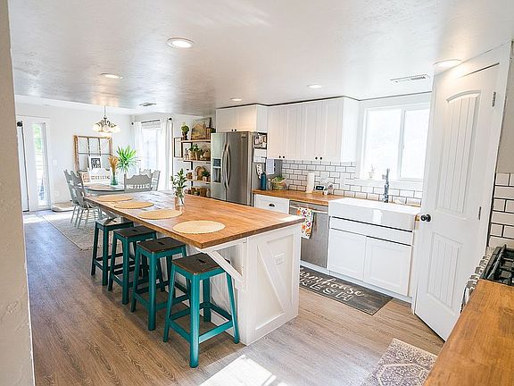 This adorable farmhouse style home has been completely remodeled from 2017-2021. Two stories with a basement. Main floor is open concept with living room, dining room and flows right into the kitchen. Kitchen has a beautiful 8 foot long island for a great breakfast bar. Newly installed butcher block countertops through. All matching stainless steal appliances that are less than 4 years old. Walk in pantry for plenty of storage! Main floor also has a full bath. Bedroom that was used as a craft space but can be that 6 bed. Big laundry room with even more storage. Upstairs features 2 bath, 2 bed and the big master suite. In the master suite you have the option for an additional living rom/seating area. A big walk in closet perfect for two. French doors lead out to the balcony. Basement is ready for an additional living space and has the option to be rented if you choose. 2 beds and 1 bath that has hook ups for a stackable dryer and washer. Huge storage room with 4 storage shelfs to store extra decorations, food storage, or whatever have you. Stand up freezer so you're not piling everything in the upstairs freezer. Living room. In the hallway it has hookups for a kitchenette or a wet bar. Outside entrance where you enter through the side of the house. Three car garage with another garage door in the back that rolls up. Attic space for even more storage and a wood burning stove. Plenty land to add animals, greenhouse, she shed, etc. Several fruit trees including 3 varieties of plums, apricots, 2 varieties of apples, and a choke cherry that is so cute! So much additional potential to come!