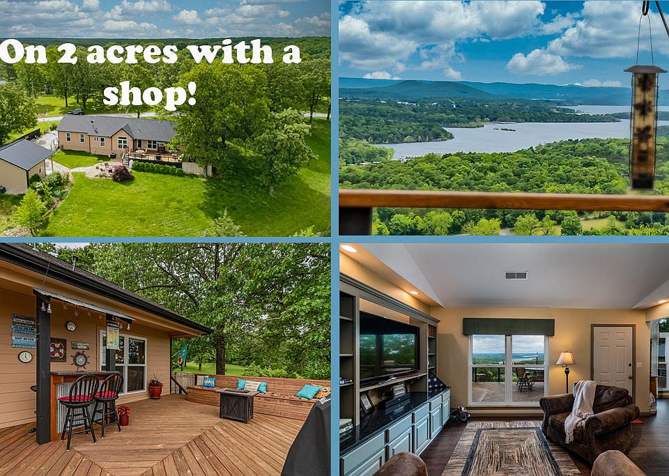 Table Rock Lake view stunner! Impeccably well maintained 3 bed 2 bath home on 2 acres with a shop and park like setting. It's a party in the back with the fabulous deck featuring a built in bench and a bar with panoramic lake and mountain views where you can see for miles and miles. Pretty landscaping brings you to the fabulous Morton building that was built in 2013. Enjoy entertaining in the open kitchen complete with Hickory cabinets with counter seating for at least 6! The large living area with built in entertainment center overlooks the lake. The master bedroom boasts a beautiful view, vaulted ceiling and nice size. The split floor plan separates the master from the other bedrooms. New roof in 2014, new Anderson windows in 2019, New water softener, UV water treatment system installed in 2020, new double sided gas fireplace in 2017, and the list goes on. This place has a big view and room for lake toys without the hassle of alot of maintenance.