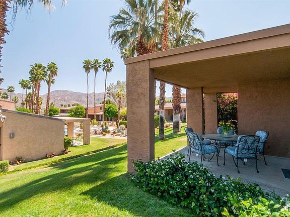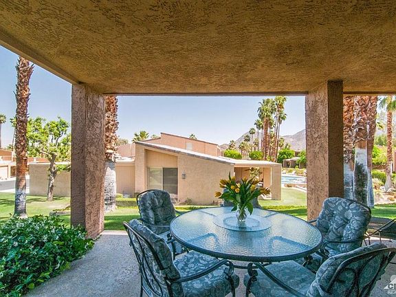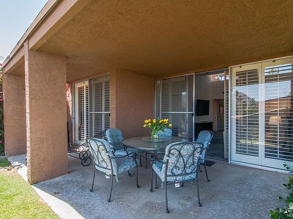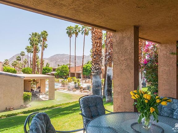 Move In Ready! A two bedroom, two bath one level unit, this home opens to a back porch with Mountain Views from the back porch and a private front porch. Featuring a cathedral ceiling the great room has expansive views to the mountains and greenbelt and is pre-wired for a large flat screen TV. The kitchen was remodeled in 2011. Opening to a gated courtyard with lovely desert landscaping. This bright airy home has just been painted and upgraded with baseboards, flat screen wiring and new lighting in kitchen, living room, and both bathrooms, New bathroom fans. Country Club in beautiful Palm Desert California is a member owned club that includes two golf courses, fitness center and tennis facilities. This home is on a corner lot with a 2019 expansion of the patio. Tile, patio furniture and landscaping is all new, This unit is one of the best locations in the Garden Villa's.