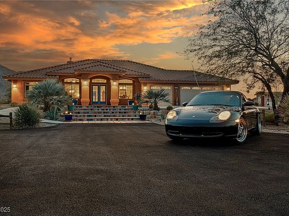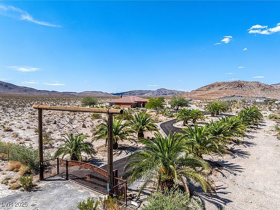 Discover a unique desert oasis in Pahrump, Nevada, featuring 3 lots on over 14 acres. This inviting Santa Fe-style home features a stunning entrance with beautiful Spanish tile steps leading to the double door entrance, and elegant porcelain wood-look tile flooring throughout. Each window offers breathtaking mountain views day and night, while the sunroom enhances the indoor-outdoor experience. The property includes fully paid commercial grade solar panels, a greenhouse, a chicken area, and trees—pistachio, peach, and pomegranate. The compound features two additional structures: an RV garage with two bedrooms, a kitchen, living area, and workshop, plus an unfinished space with a sound studio and basement, providing endless possibilities. Enjoy complete privacy with 3 wells, septic systems, and multiple RV hookups in this fully fenced sanctuary. Embrace tranquility and uncover the potential of this exceptional property—your dream ranch awaits!
