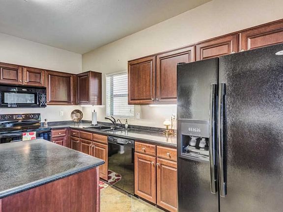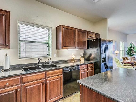 FORMER MODEL! Nicely upgraded and well-maintained home! 4 bedrooms / 2 baths - Formal living & dining room - Large great room off kitchen - Spacious kitchen with corian countertops, black appliances, kitchen island, large, walk-in pantry & built-in desk - Large master suite with french door exit to covered patio, walk-in closet, dual sink vanity & separate shower and garden tub - Custom Paint - Tile throughout traffic areas - Water softerner - R/O system - Large private, fully landscaped backyard with covered patio - Refrigerator, washer and dryer included - Great curb appeal with stone accents and much more!