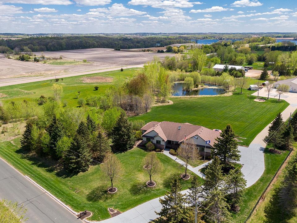 Rare opportunity - Custom rambler on 10 acres with 3-4 pasture acres for horses and incredible outbuilding! Property fits so many needs! Beautiful country setting on winding paved street and just minutes to town in the Prior Lake School District. Home features vaulted main level, 3 season porch, 7 zone infloor heat, Master Suite retreat with relaxing solarium sun room with nature views! Versatile walkout lower level offers an option for a Mother In-law apartment with an additional private staircase that leads directly to the heated 4 car garage! Incredible concrete driveway leads all the way to the outbuilding. Outbuilding features concrete floors, heated/AC, bathroom, floor drains plus additional 17x55 outbuilding for over 4200 sq. ft. of storage! Park like manicured yard w/ 15 zone irrigation. Pride of ownership inside and out!