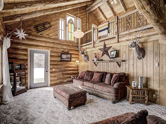 Handscribed one-of-a-kind log home on 40 acres with vista views of forest, open land, trails and a natural pond. 3 BR, 3 BA home has unrivaled character throughout with log beams and staircase, fieldstone fireplace, built-in bunks and wood floors. Large open kitchen has stone counters, farmhouse sink and breakfast bar. Sun room, open loft, family room with bistro area, and dedicated lower level mud room for post outdoor activities. Detached garage with closed storage and huge storage building with heated shop. A treasured home!