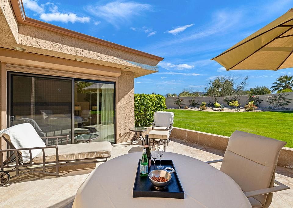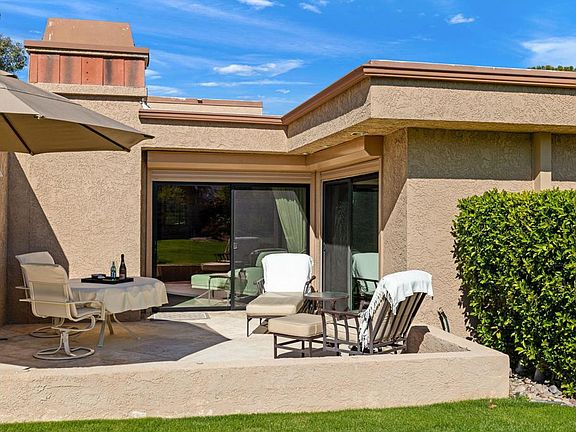 Welcome to Indian Hills, a hidden gem tucked below the prestigious Bighorn Golf Club in the heart of South Palm Desert. Prepare to be enchanted by this meticulously maintained and completely remodeled condo, where luxury, privacy, and convenience converge in perfect harmony. As you step into this immaculate property, pride of ownership is palpable at every turn. The interior has undergone a transformative renovation with a raised ceiling in the living area & built-in cabinets throughout the property offering both style and functionality. The kitchen is a chef's delight, featuring top-of-the-line Miele appliances. Whether you're preparing a gourmet meal for guests or enjoying a quiet breakfast at the breakfast bar, every moment in this kitchen is a pleasure. Adjacent to the kitchen, the dining area offers the perfect setting for intimate dinners or festive gatherings. Plus, share your favorite bottle of wine from the cabinet in the wet bar. The expanded back patio beckons you to step outside and soak in the breathtaking views of the lush greenbelt and majestic mountains. With its eastern/southern orientation, the patio is an ideal spot to bask in the warm desert sun or savor a cool evening breeze. The primary bedroom is a serene retreat, boasting a spacious layout with an en-suite bathroom with luxurious shower. Indian Hills offers six pools/spas, tennis & pickle ball. Plus, just two miles from El Paseo. Don't miss your chance to make this desert dream home your own!
