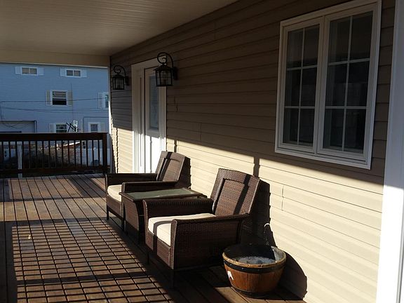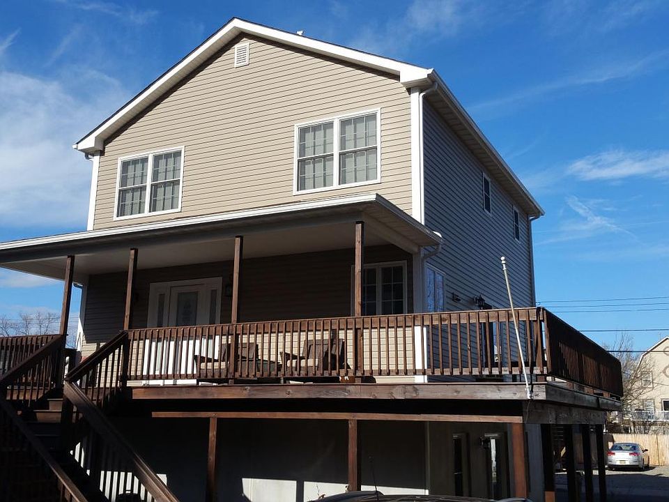 New home built after Sandy. HW floors, 9' ceilings on the first floor; open floor plan with wood burning fireplace decorated with wood surround; recessed lighting first floor; laundry room and half bath all on 1st floor. Sliding glass doors in DR goes out to a wrap-around deck; skylights in master bedroom; Jacuzzi and vaulted ceiling in master bath; full basement @ground level due to being raised and has option to be turned into the garage. Flood insurance is $450/year.