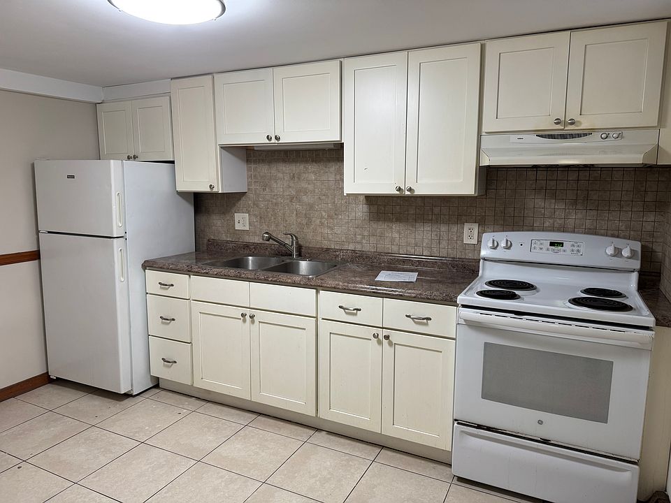 Eat-in kitchen with new white cabinets, countertops, and backsplash, and including oven range and refrigerator.