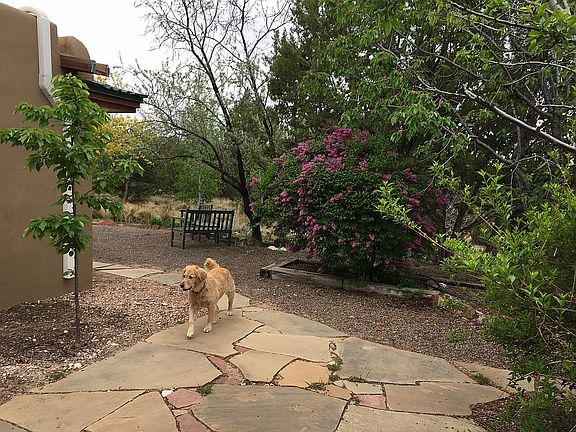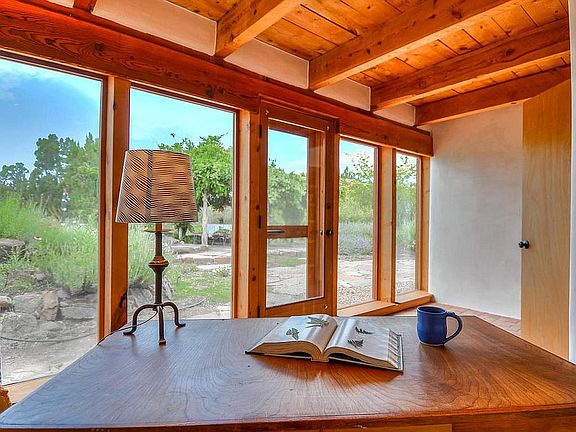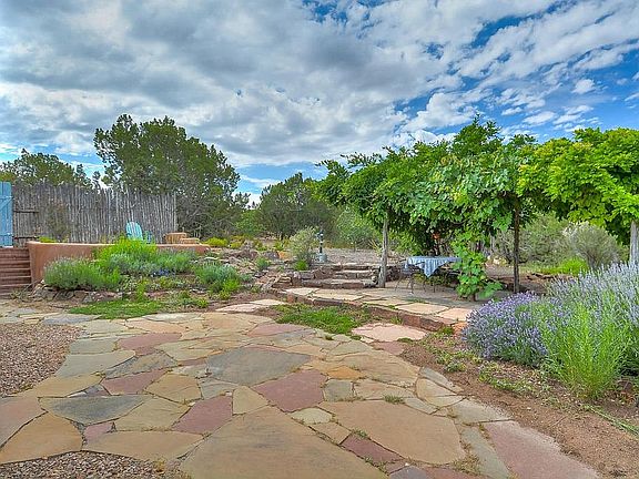 Gorgeous Southwest passive solar adobe home located on a breathtaking 6.50 acres outside of the Santa Fe city limits. Home features 2,165 sqft with 2 bedrooms, 2 offices, 2 full baths, detached heated 2 car garage with studio. Also includes a separate 400 sq ft casita studio apartment. Adobe walls & brick floors provide a thermal mass for natural heating and cooling. Spacious living area with wood beamed ceilings, built-in media center, gas stove and garden views. Charming country kitchen w/ honeywood cabinetry, built-in oven, Wolf range cooktop, range hood and center island. Beautiful master suite with private bath and private garden. Enjoy dinning beneath the wisteria arbor in the fragrant lavender garden. 2 Horses allowed!