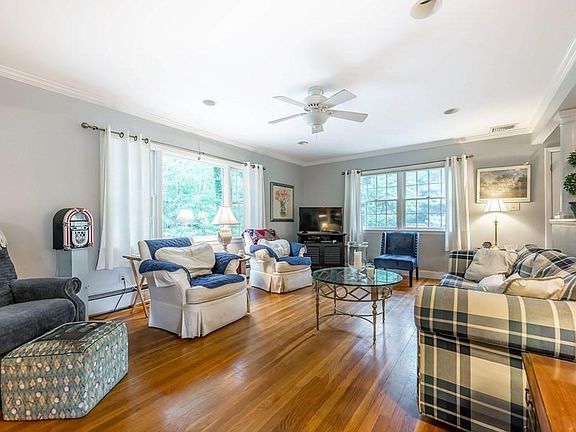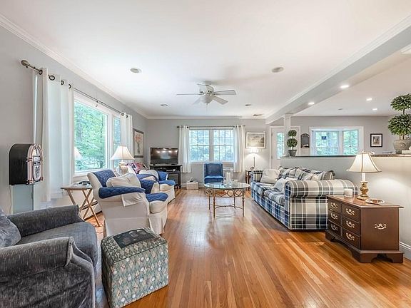 Large Split Entry home on prime lot in sought after neighborhood and school district! This home features an updated eat in kitchen with ample cabinetry, tile floors, granite countertops, center island with pendant lighting plus a bay window overlooking side yard. The kitchen also includes a breakfast bar with additional seating for causal meals and an adjacent sun filled family room with recessed lighting, crown molding and hardwood floors. Youll also find a pocket doors that leads you into the formal dining room with hardwood floors, brick accent wall with fireplace plus slider access to rear yard. The bedroom wing features 3 bedrooms with double closets, wood flooring and 2 updated baths. The lower level includes a family room/play room, 4th bedroom and half bath. A two car garage , A/C on the main floor and convenient location to town, train and schools add to this attractive home.