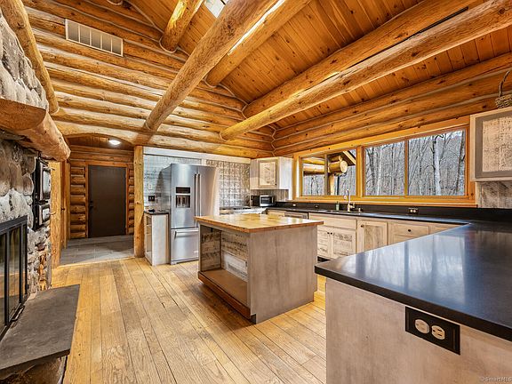 Imagine a home where every day feels like a luxurious retreat, a unique log-cabin home inspired by the elegance of Aspen, Colorado. This private sanctuary boasts architectural features that blend rustic charm with modern sophistication, creating an ambience of perpetual vacation. Soaring cathedral ceilings creating a sense of space and openness with the centerpiece of the living area is a floor-to-celling stone fireplace. Skylights invite streams of natural sunlight to bathe the great room and kitchen. Enjoy the primary bedroom on the main floor with a beautifully renovated full bath and sliders to your own private deck. This area is ideal for morning coffee, evening reflections, or simply soaking in the surrounding natural beauty. Adjacent to the expansive main deck is a generously sized, covered entertaining space equipped with a fully functional bar. This area is perfect for hosting gatherings, providing shelter from the elements while allowing guests to enjoy the natural beauty of the backyard. The walk-out lower level is spacious with a full bath, office/bedroom area and sliders to the private backyard. Integrating geothermal heating in this home promotes economic efficiency and environmental sustainability. Reach out to arrange a private tour of this special property.