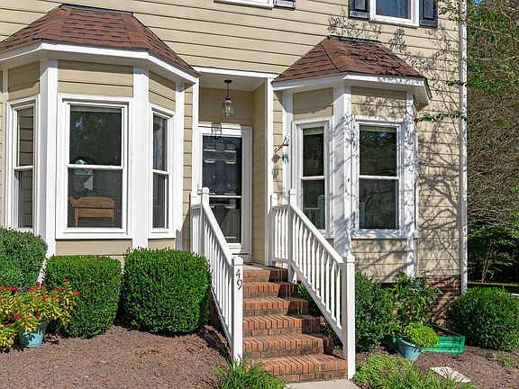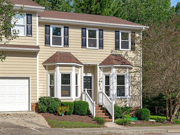 Nestled in the popular Woodcroft community of Revere's Run, this beautiful updated townhouse offers a perfect blend of modern elegance and tranquil living. As you step inside, you're greeted by an inviting floor plan accentuated by vaulted ceilings that created a bright and airy living room space plus windows galore that provide a ton of natural light and a wood burning fireplace perfect for entertaining or cozy family gatherings. The updated kitchen has an island offering additional prep space and bay windows in both the kitchen and the separate dining room. The main floor primary suite is a true sanctuary featuring generous closet space and a luxurious en suite bathroom. Two additional bedrooms upstairs for family, guests or a home office. Step outside onto your private deck where you can relax and unwind while enjoying the serene wooded backdrop. Ideally located along tree lined streets, sidewalks for strolling, trails minutes from Harris Teeter, shops, restaurants, Streets at Southpoint and quick access to highways, UNC and Duke. You can't beat an end unit townhouse tucked back at the end of the community for peace and privacy.