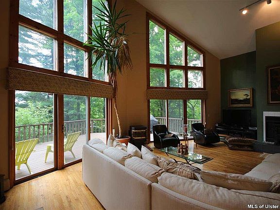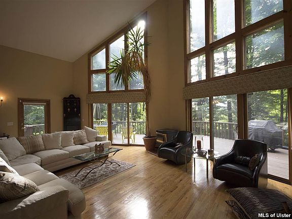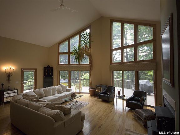 LET THE SUNSHINE IN!- Dramatic glass walled cedar sided contemporary is flooded with natural light. Well sited near historic Kripplebush hamlet, this perfect retreat features an airy & open floor plan perfect for entertaining, expansive cathedral Great Room with cozy fireplace and energy saving pellet stove, dining space, kitchen with breakfast bar, full floor ensuite MBR plus guest BR & add'l full bath on main level, hardwood & ceramic floors, a full length deck invites relaxation and al fresco dining.