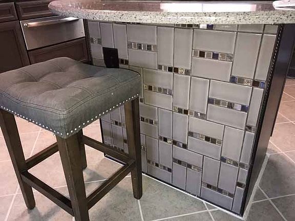 - KITCHEN DESC: Eat In Kitchen, Crown Mold, Tile, Kitchen Island, 9? Ceiling, Chair Rail