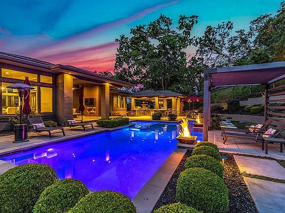 Gated vineyard property puts Sonoma Valley inspiration in the heart of Alamo! Panoramic east-facing Mt. Diablo views. Designed by Steven Kubitschek, this light-filled open floorplan features 2 Nano doors for a seamless flow to the resort-inspired yard including a saltwater, solar-heated pool, covered deck with gas fireplace, pergola, pool bathroom, and cabana with full kitchen, BBQ, wine refrigerator, 2-tap kegerator, dishwasher, warming drawer. Mostly single-level living with 1 bedroom suite + bonus on lower-level, private entry. Expansive living room with fireplace and slider to front-facing terrace. Formal dining room. Gourmet kitchen with Quartz counters, oversized island/breakfast bar, Thermador appliances. Executive office offers terrace access and views. 500+ bottle custom-designed wine cellar. Luxurious primary suite in private wing with backyard access. Floating vanities in en-suite, freestanding tub, marble tile shower surround, Brizo faucets.