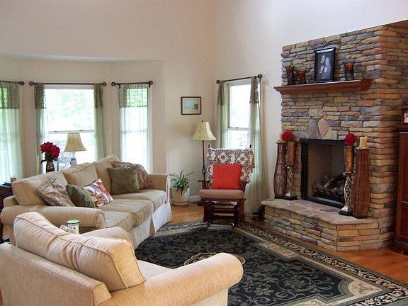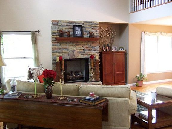 Lovely home in super neighborhood. Quiet and peaceful location with nice wrap-around porch for relaxing. Generous size kitchen with breakfast area. Vaulted ceilings in living room with balcony sitting area overlooking the living room. All essentials for living on the main level with 2 nice sized bedrooms, bath and family room on the upper level. Lots of hardwood flooring and stone, gas log fireplace.